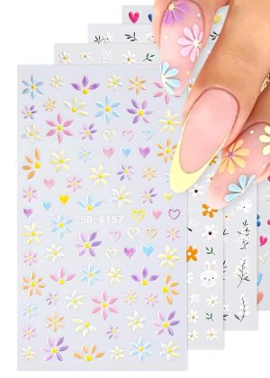 Flower Nail Art Stickers, 5D Embossed Nail Decals Nail Art Design Self Adhesive Nail Supplies with Nail Tweezer, Colorful Flower Nail Stickers for Women Manicure Decoration